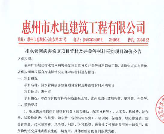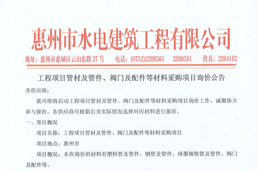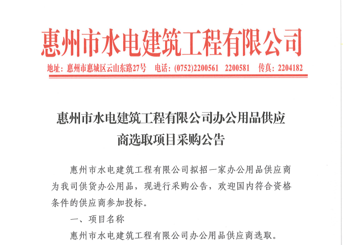 惠州市水電建筑工程有限公司辦公用品供應商選取項目采購公告……